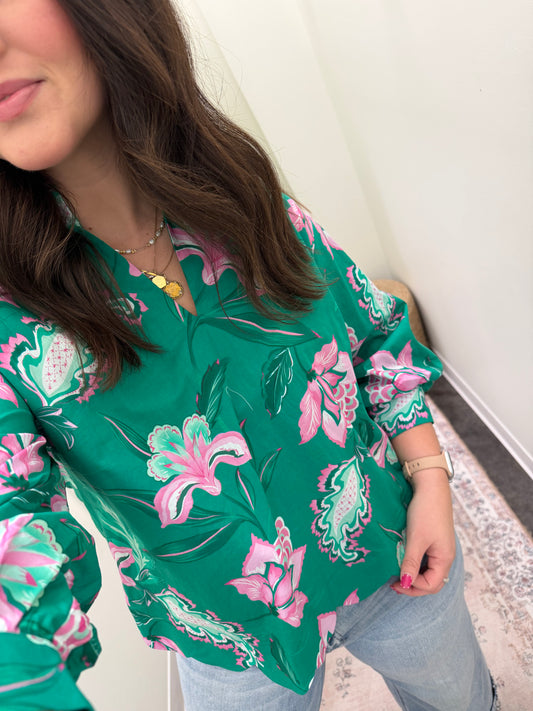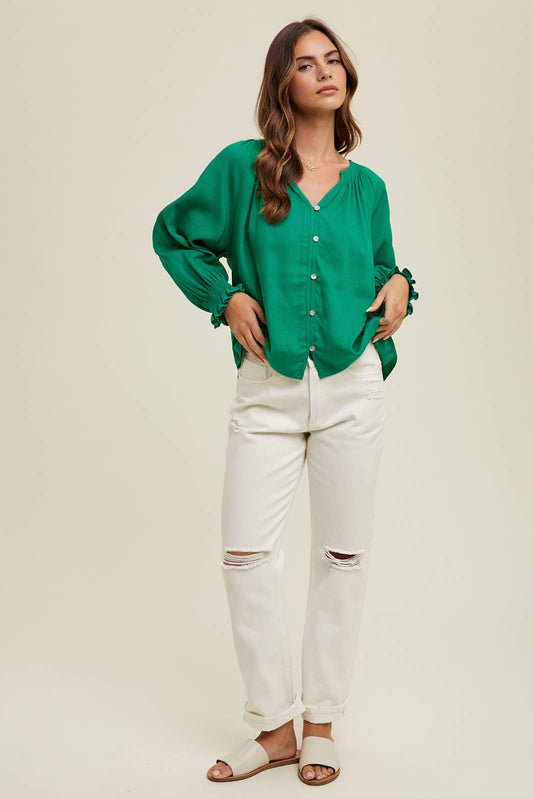 DROP SHOULDER BLOUSE/SMOCKED CUFF DETAIL