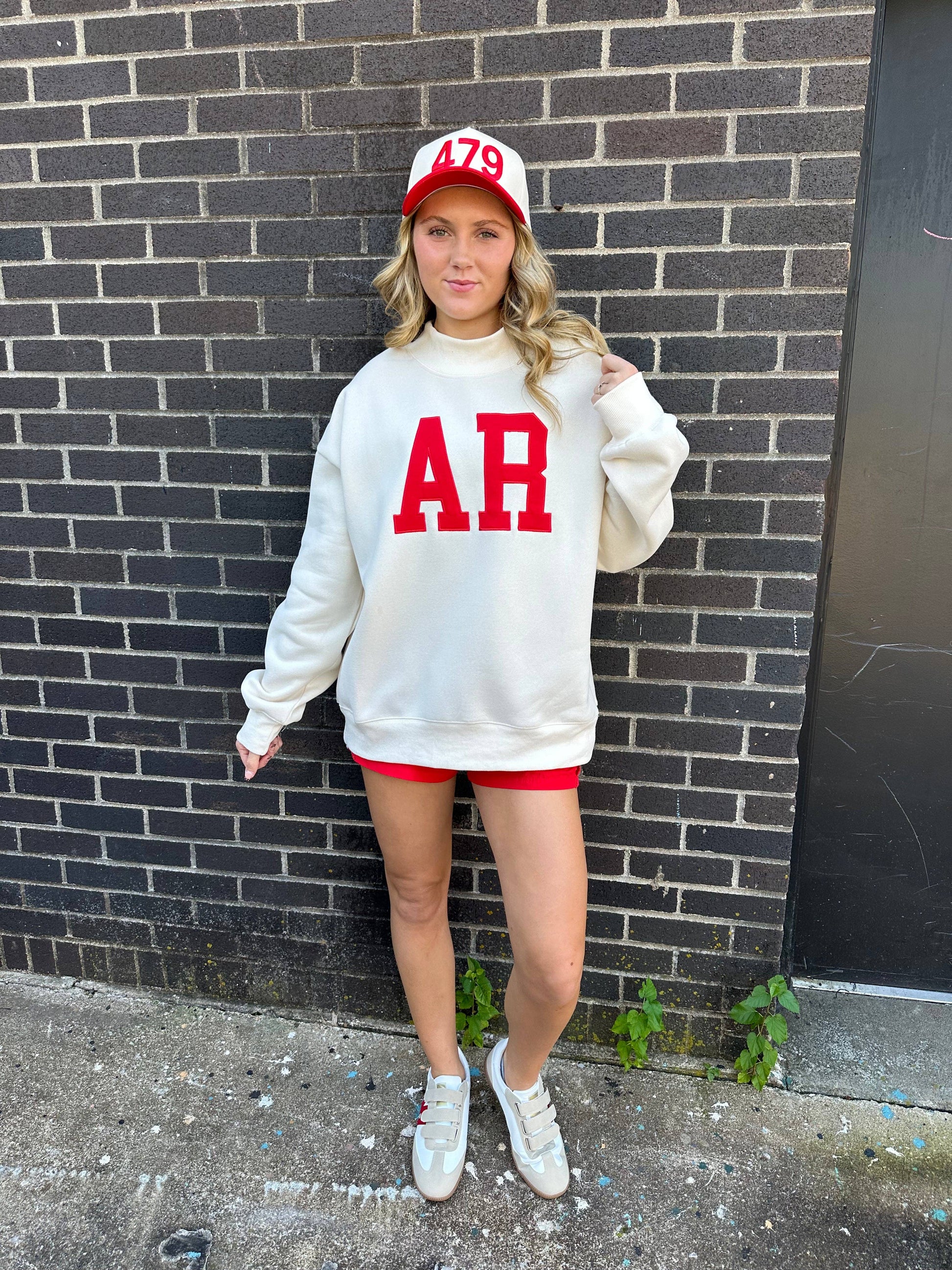 Our AR Embroidered Mock-Neck Sweatshirt is a standout piece from Social Statement, an all-women owned business from the vibrant college town of Fayetteville, Arkansas. This sweatshirt, fitting like a large/x-large, is adorned with exquisite embroidery, reflecting our specialty in creating unique apparel for greek, gameday, and everyday wear. It's more than just a sweatshirt, it's a statement piece that you'll love to wear. Enjoy the comfort and style it brings to your activewear collection.