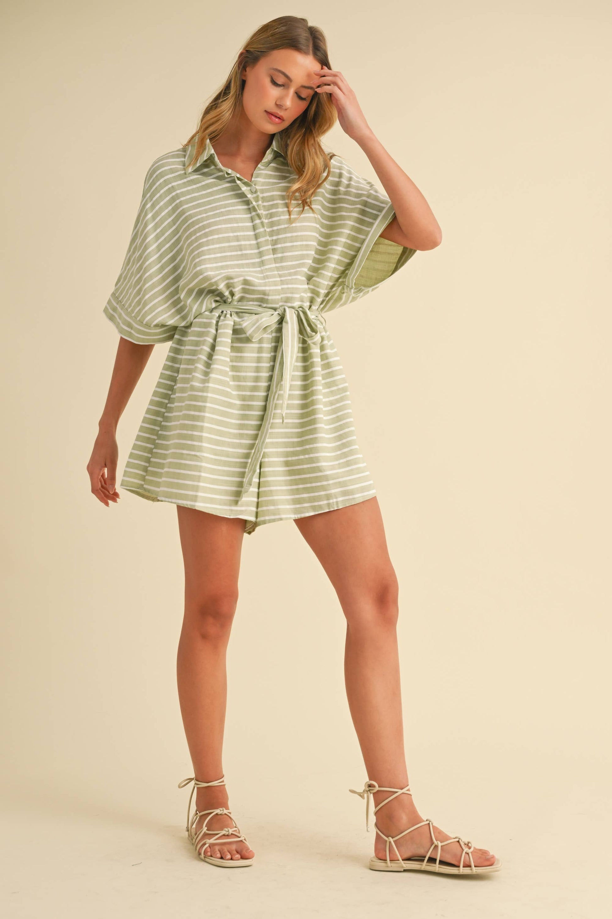 STRIPED RELAXED FIT BELTED SHORT SLEEVE ROMPER