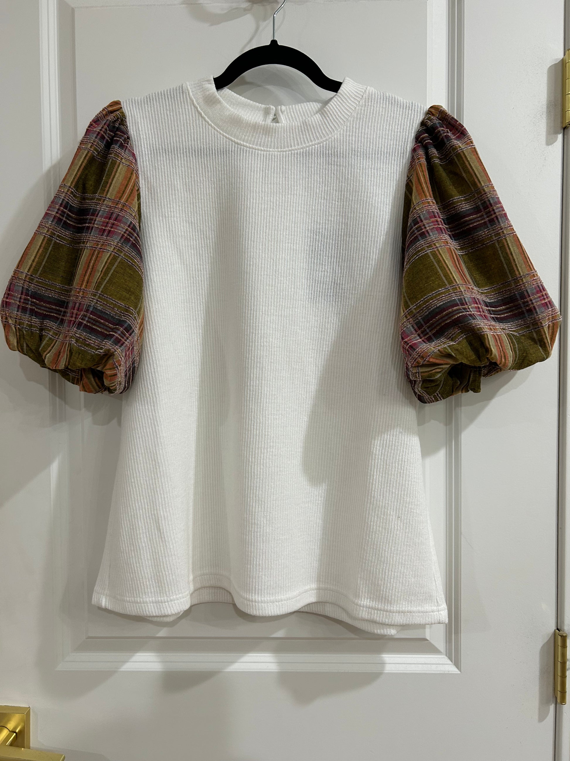plaid puff sleeve mixed media top